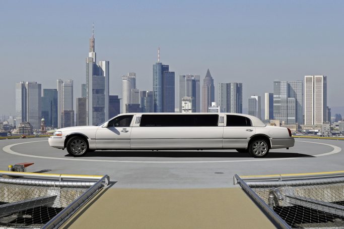 KI-generierter Sportwagen auf einem echten Heliport vor einer realen Skyline (Bildmontage)